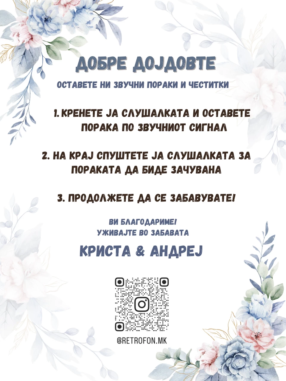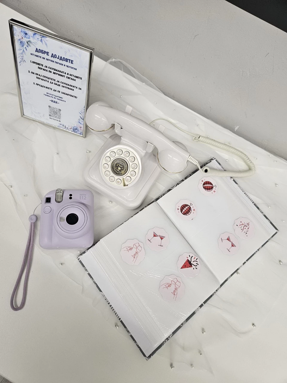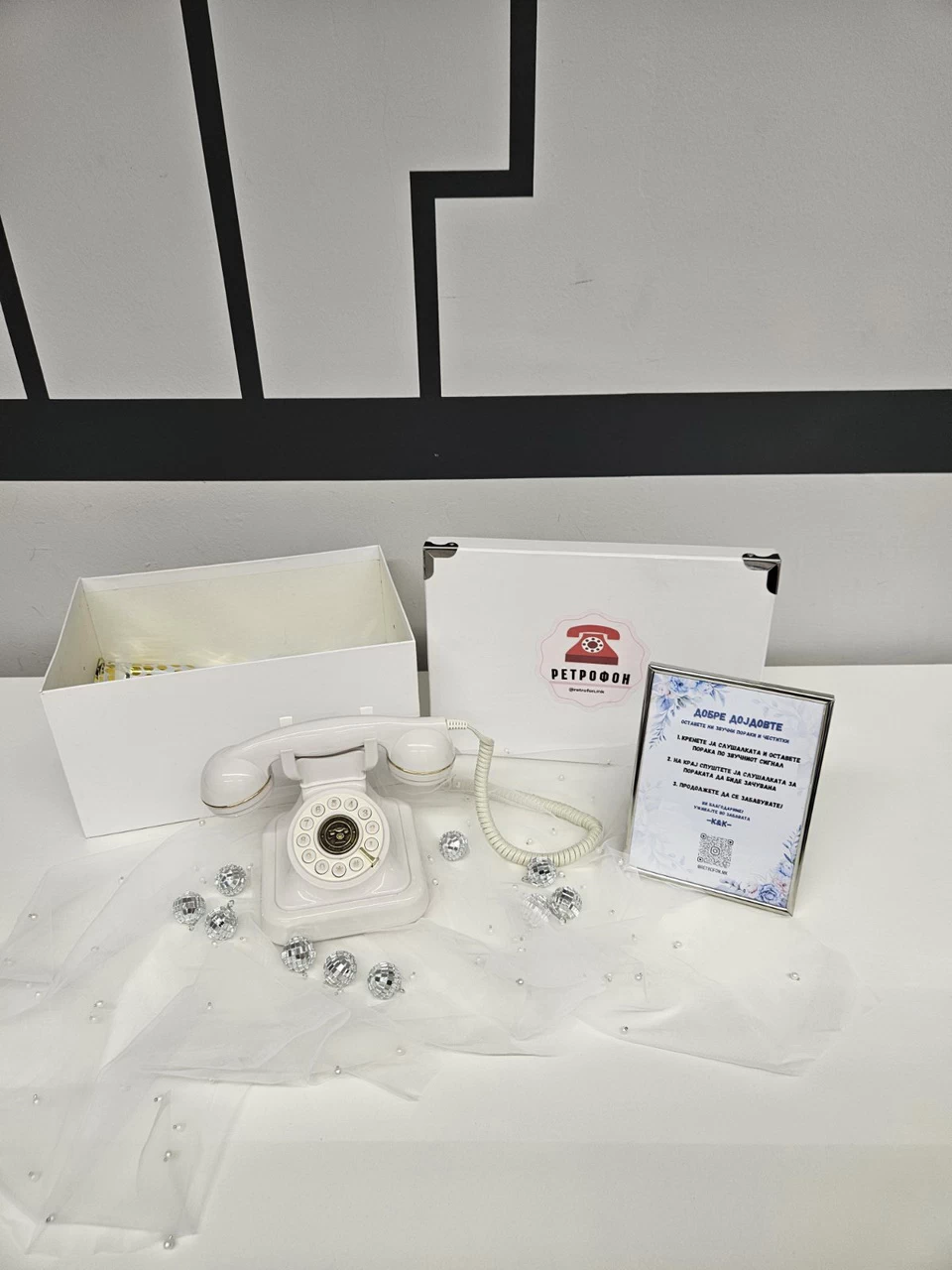 Основниот пакет вклучува само ретрофон и рамка со постер и персонализација – дизајнирана во консултација со младенците. Сепак , имаме дополнителни опции како украсни рамки, персонализирани пораки , картички со прашања , и други декоративни детали што може да ги додадеме за уште поголем ефект.